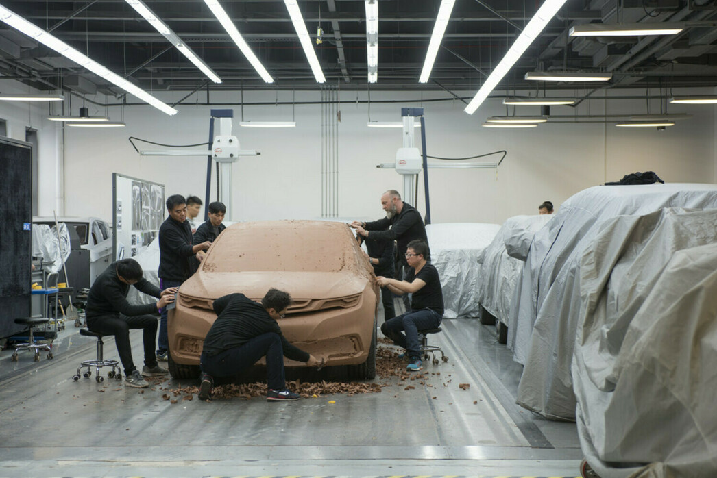 Гай Бургойн при помощи нескольких коллег снимает плотный тент и презентует нам новейший кроссовер, выполненный в натуральную величину полностью из глины. Он объясняет, что прежде, чем тот или иной концепт-кар пойдет в производство, его обязательно слепят — ведь только так можно понять, как будет выглядеть реальная машина. Впрочем, и здесь ничего нового в Geely не изобрели — эту технологию на протяжении десятков лет используют и другие автостроители.