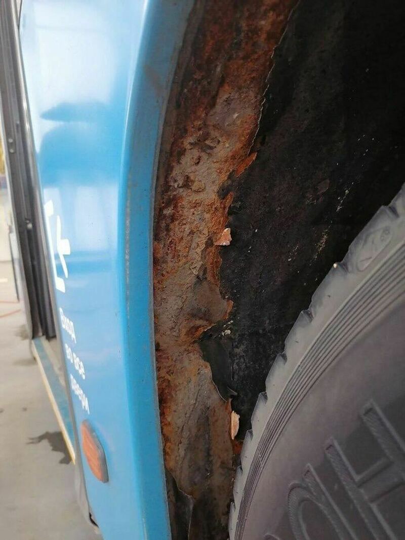 Ряд телеграм-каналов опубликовали, так сказать, подноготную синего московского электротранспорта. На фото видно, что кузова машин за три года эксплуатации на городских линиях покрываются толстым слоем лохматой ржавчины. Причем не точечно, а почти целиком: начиная с колесных арок и заканчивая рамками окон.