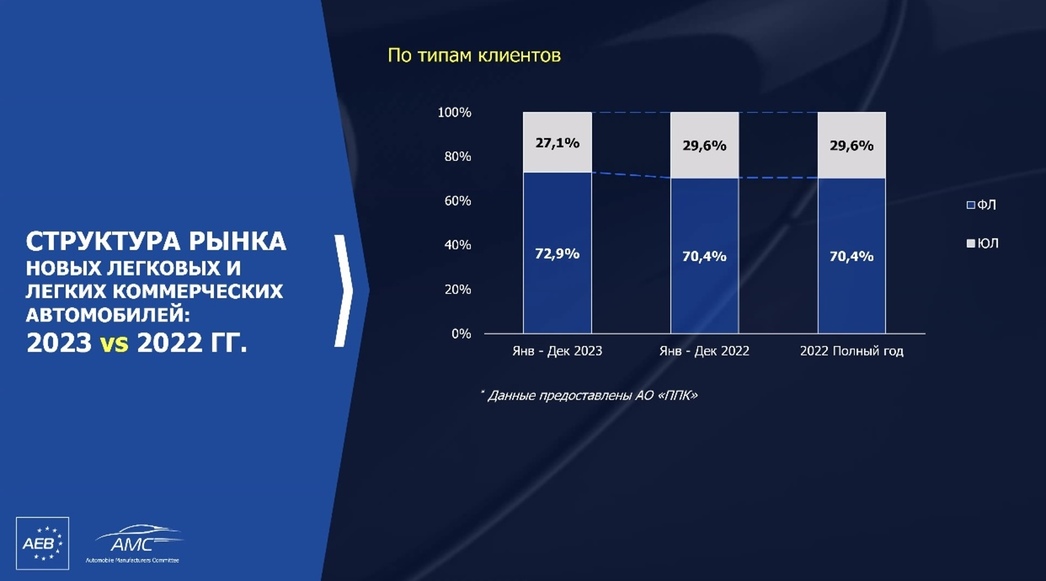 Согласно статистике Ассоциации европейского бизнеса (АЕБ), в 2023-году лишь менее 30% от всех проданных машин ушли во владение юридических лиц. Все остальное попало в семейные гаражи «физиков». «Юрикам» отчего-то новое китайское предложение не очень понравилось, поэтому надежды продавцов восточной техники оперативно занять корпоративные парки и быстро выдавить оттуда старожилов не оправдались.