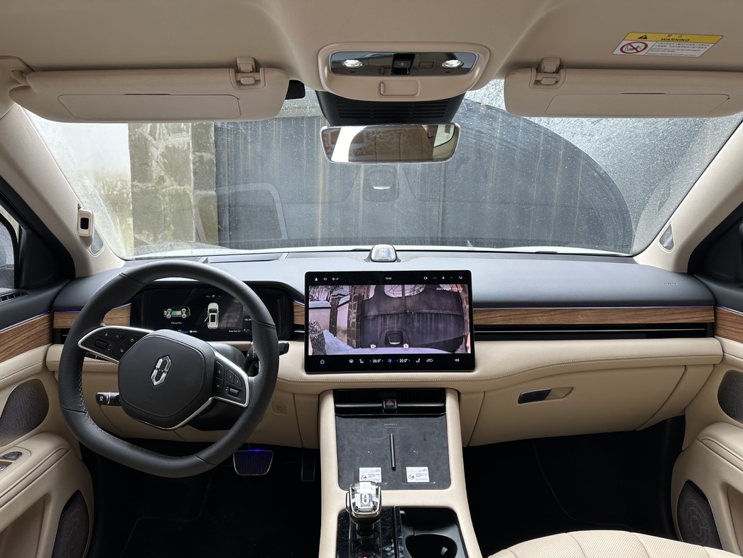 Рычаг коробки выполнен в стиле «Хрустальная ручка» — смотрится дорого-богато, словно на самых дорогих версиях BMW. Салон ничем не уступает премиальным европейским и японским брендам. Правда, солнцезащитные козырьки с откидывающимися вниз магнитными крышечками, на мой взгляд, довольно спорное решение. Впрочем, такие же неудобные они и на младшем собрате AITO M5.