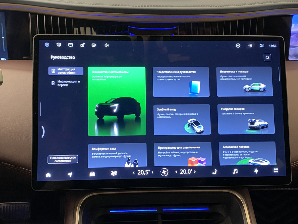 Внутри — китайская роскошь в хорошем смысле и предельное на сегодняшний день оснащение: приятные глазу оттенки натуральной кожи, стеклянный потолок с отделкой из алькантары, огромный, размером с телевизор, экран мультимедийной системы, стерео Meridian, «умное» зеркало заднего вида — только видео, никакого отражения. Экранов — три: для водителя с приборами, 15,6-дюймовый центральный и отдельный для переднего пассажира.