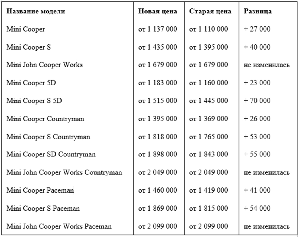 С 1 октября 2015 года стоимость автомобилей MINI увеличивается на 2-4%, за исключением спортивной линейки John Cooper Works. Повышается также цена на дополнительное оборудование: для моделей Paceman и Countryman — на 5%, а для трех- и пятидверных версий MINI Cooper и MINI Cooper S — на 10% и 14% соответственно.