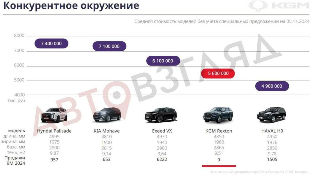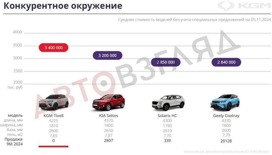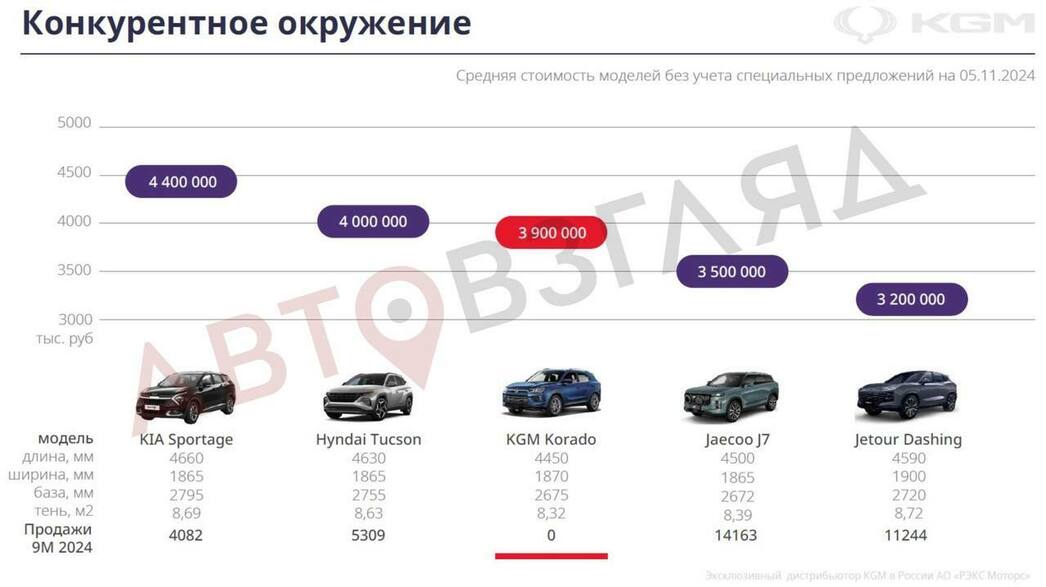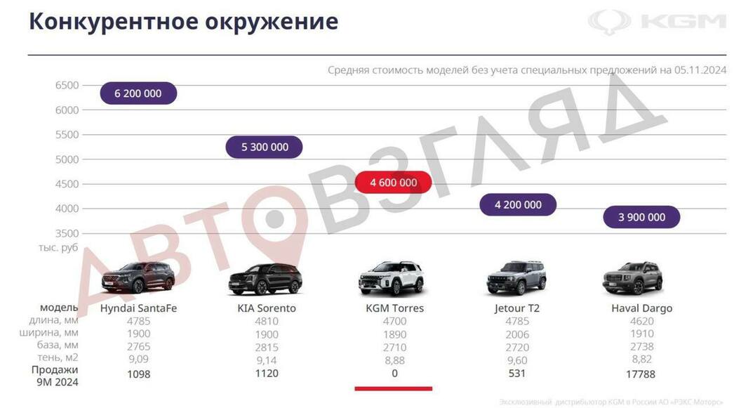 Уже не секрет, что KGM предложит россиянам четыре модели. И как стало известно порталу «АвтоВзгляд» из дилерских материалов, наибольшие надежды дистрибьютор возлагает на кроссовер Torres — в компании надеются, что на него будет приходиться 50% всех продаж бренда. Вторым по популярности (25%) должен стать Korando, третьим — внедорожник Rexton (20%), четвертым — Tivoli (5%).