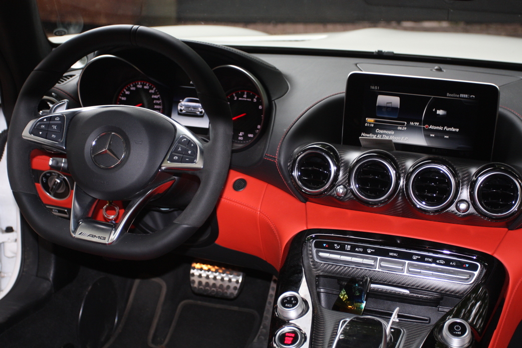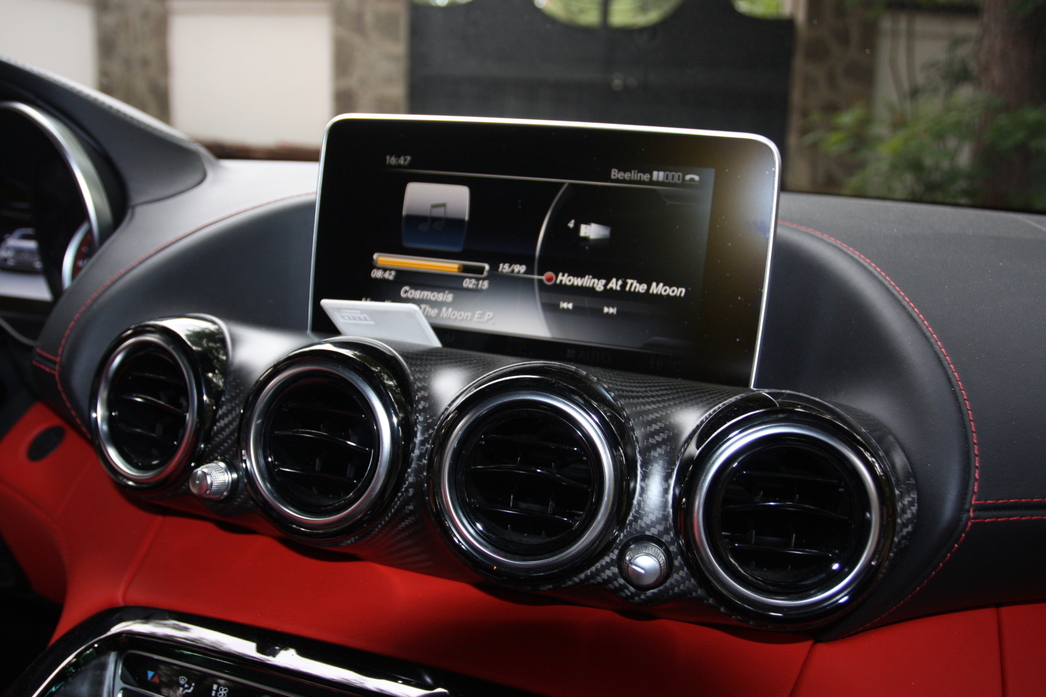 Внутренне пространство этого гоночного болида людям с ярко выраженной клаустрофобией может показаться невероятно тесным, однако нельзя забывать, что вы не в представительский лимузин залезли в ожидании персонального шофера, а находитесь внутри машины, созданной водителями для водителей. Залезая в салон погружаешься в объятия спортивных ковшеобразных анатомических кресел, создается реальное ощущение, что сидишь пятой точкой непосредственно на асфальте. Кокпит словно окружает водителя и пассажира по кругу, на центральном тоннеле расположились большие круглые кнопки, управляющие режимами пилотирования, настройкой трансмиссии и выхлопа, а также музыкой. В тестовой машине салон обтянут ярко-красной кожей, отделан карбоном и алькантарой. В общем, все круто. Позади сидений в типично спортивном стиле расположилась карбоновая балка-распорка для усиления жесткости кузова, ну а за ней начинается багажник, причем отнюдь не крохотного размера, что не так уж и распространено в автомобилях подобного класса. Одним словом, немцы подтверждают главную особенность AMG-GT – это действительно довольно практичный суперкар на каждый день.