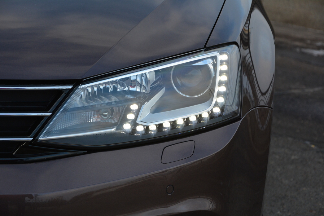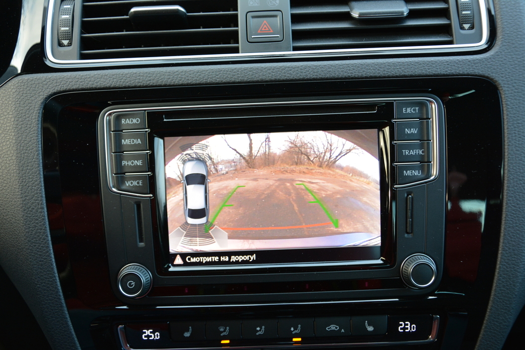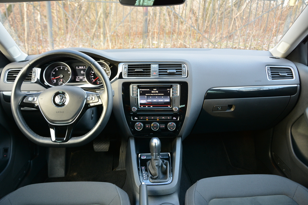 Увидев однажды, например, Polo Sedan, вам уже не нужно никого расспрашивать, как выглядит Passat. Считайте, что вы и так уже это знаете. В этом смысле Jetta — ломоть «фольксвагена» средних размеров! Все та же фамильная остроугольная форма передних блок-фар с непременными гирляндами дневных ходовых огней. Семейная черта в виде пары граненых ребер по краям капота тут тоже, разумеется, присутствует. И оформление «кормы» Jetta точь-в-точь как у «родни»! Вообще, надо признать, что нынешняя Jetta смотрится как полноценный «маленький Passat». И с интерьером своих «матрешек» ребята из Вольфсбурга вообще никогда не церемонились! Различия между салонами моделей одного поколения, как правило, заключаются лишь в длине списка возможных опций. Что же касается исследуемой нами VW Jetta, то ее салон практически идентичен салону любого современного VW. Все та же отлично читаемая «приборка» с двумя «циферблатами» (тахометр и спидометр) и ЖК-монитором бортового компьютера посредине.