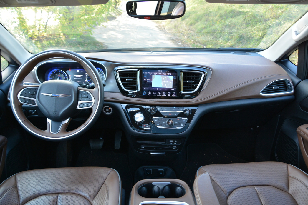 Кстати говоря, оформление приборной панели, стиль «картинок» на тачскрине монитора мультимедиа в центральной консоли, характер проработки «вращалок-нажималок» системы климат-контроля и прочего — все тут выглядит вполне по-европейски, без малейшего намека на «староамериканскую» простоватость и пренебрежение к деталям дизайна. Все очень культурно, функционально и богато. Почти как в каком-нибудь авто из премиум-сегмента. Да и цена, надо сказать, у Pacifica вполне премиальная — 4 млн. рублей!