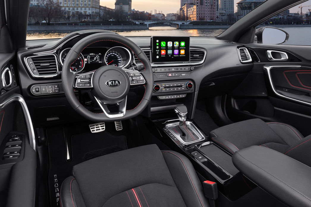 В салоне любой ProCeed имеет практически максимальную комплектацию, если сравнивать с линейкой стандартных Ceed. Оба — со спортивным рулем, 8-дюймовым тач-скрином «мультимедийки» во главе центральной консоли, ЖК-приборкой и т. п. У GT, в отличии от GT lne, водительское сиденье с электроприводом и присутствует здоровенный люк в крыше.