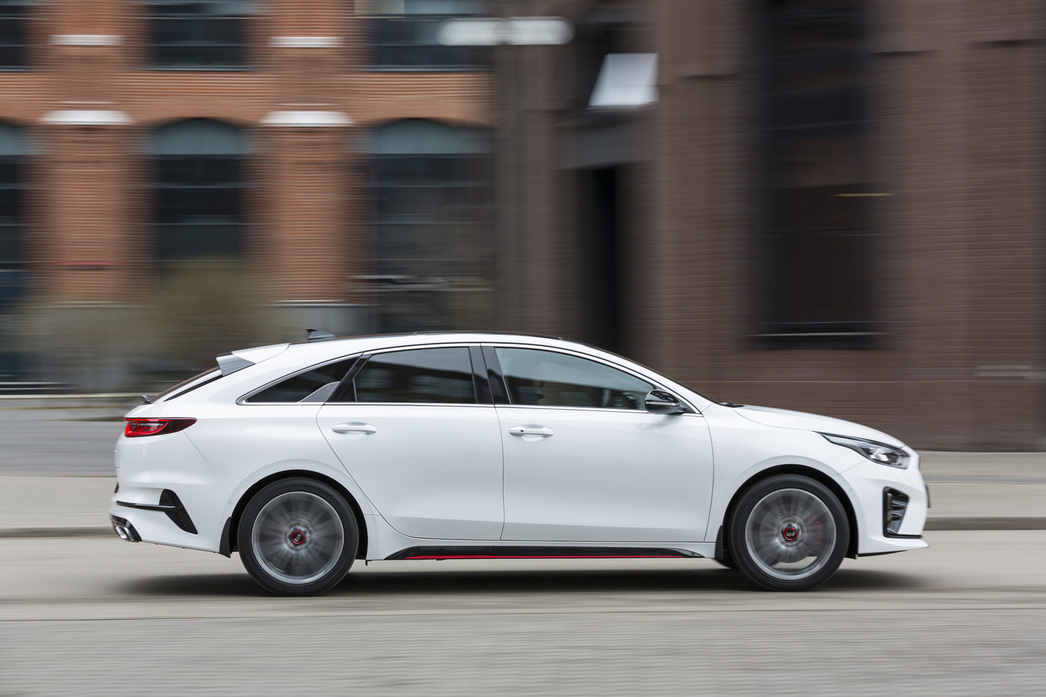 Но это не стандартный универсал KIA Ceed SW. Задние стойки у ProCeed наклонены вперед под очень большим углом — 64º. Это придает профилю машины с вместительным багажником (почти 600 литров) изрядную порцию легкомысленной стремительности.