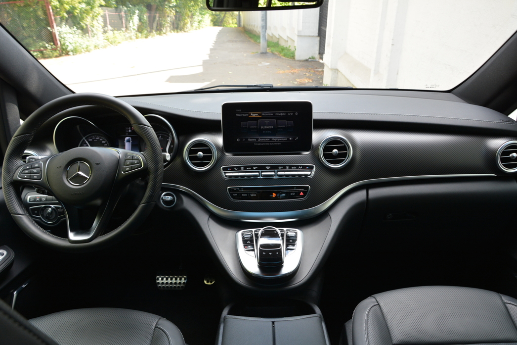Он тут не водитель «маршрутки», дело которого доставить «верхушку» компании в аэропорт. Драйвер V-klasse не будет завидовать гражданину, пилотирующему, например, Mercedes GLS! У него точно также есть все, что ожидаешь от большого Mercedes: комфорт посадки (только еще выше и лучше видно дорогу), фирменные мерседесовские «фишки», типа «планшетника» мультимедийной системы, управляемого джойстиком и сенсорной панелью, системы кругового обзора, распознавания знаков и слежения за разметкой, небольшой и хваткий руль, обернутый кожей…