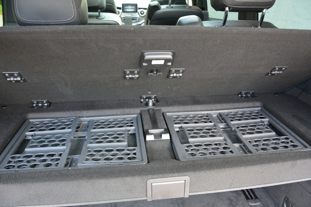 Очень полезная штука, как показала практика. Особенно, когда в салоне ухает Rammstein, а детям на третьем ряду вздумалось побеситься: срочно рявкнуть на подрастающее поколение в целях восстановления конституционного строя на борту — легко. Среди условных недостатков компоновки салона V-klasse можно назвать отсутствие прохода между водительским сиденьем и задней частью салона, как это сделано в том же VW Multivan. Зато вместо него тут разместился подлокотник со встроенным ящиком, а еще пара подстаканников для задних пассажиров. Охладить или подогреть напиток — пожалуйста!