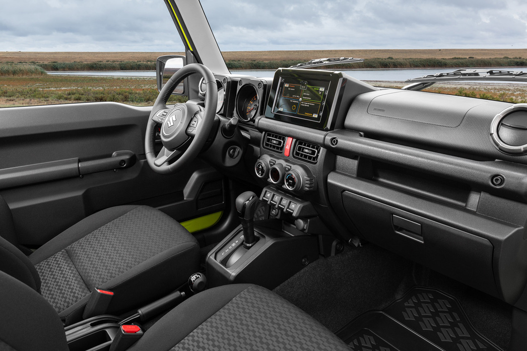 Внутренний мир Jimny богат и разнообразен. Наконец-то кресла стали на 70 мм шире, а еще появилась невиданная доселе роскошь — регулировка руля по высоте. Стеклоподьемниками (автоматический — привилегия только лишь водителя) управляют с помощью тумблеров, а не кнопок. Это практично, ведь так можно ехать, не снимая перчаток. Кстати, сенсорный экран мультимедиа тоже не отказывается работать, когда давишь на него пальцем в перчатке. Круто!