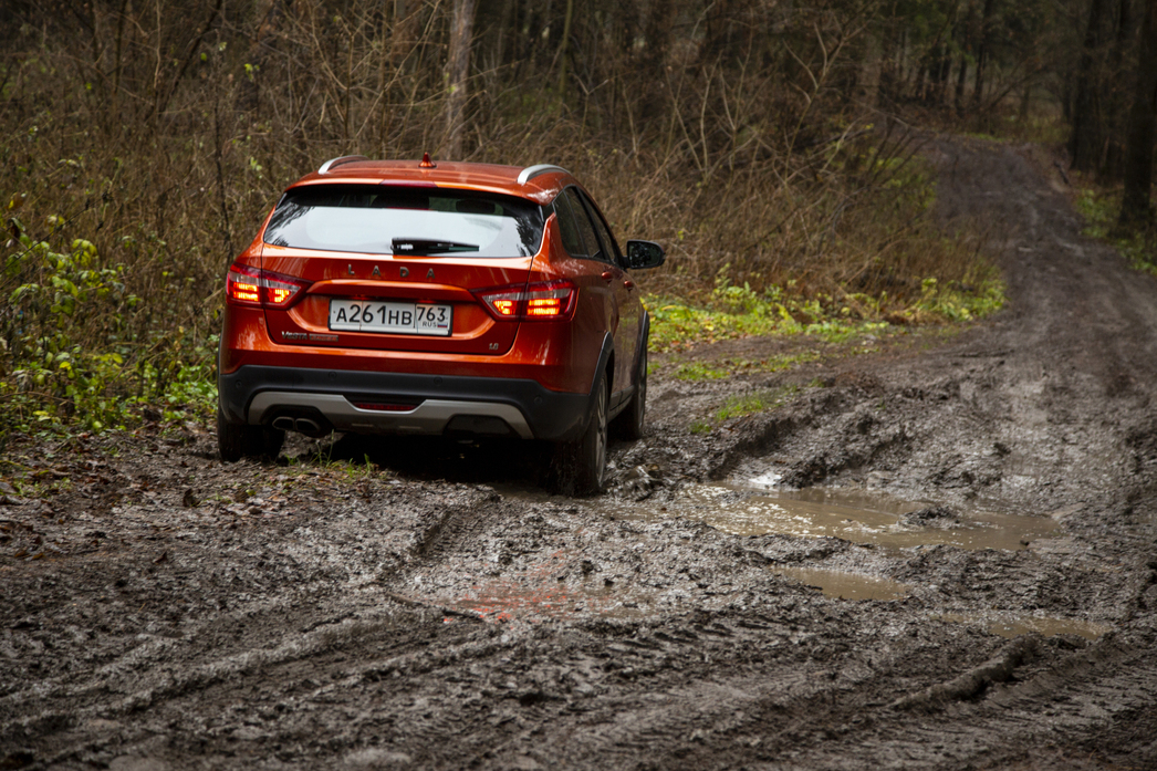 Важнейшая опция любого автомобиля, который намеревается съехать с дороги в грязь — это даже не полный привод. К тому же, кроссоверы у нас зачастую покупают только с одной ведущей осью. Главное — это дорожный просвет. И тут ожидается первое открытие: от нижней точки кузова вазовского универсала до земли — целых 203 мм. Много это или мало? На 25 мм больше, чем у простого SW, и на 13 мм выше «кроссовера всея Руси» — Hyundai Creta. Слабенькое сравнение, согласен.