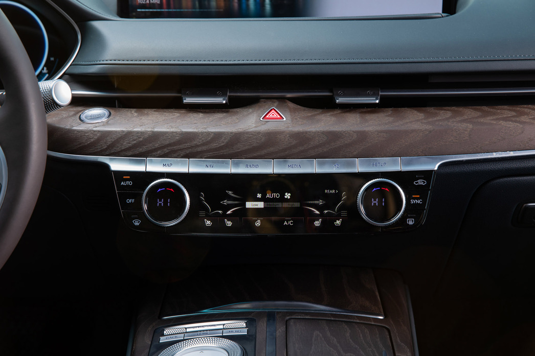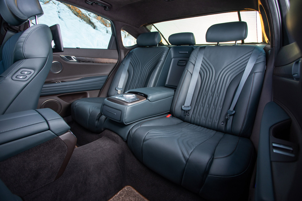 На втором ряду формально три места, однако третий будет лишним: форма дивана однозначно намекает на комфорт лишь для двоих, да и центральный тоннель здесь ну очень велик. Подголовник посередине довольно условный — в отличие от гипертрофированного откидного подлокотника, на котором помимо ящика для хранения мелочи нашлось место для выдвижных подлокотников и, что куда важнее, для блока управления всевозможными функциями, вроде настроек сидений и активации подогрева и вентиляции. Здесь же расположен и контроллер, управляющей мультимедийной системой. В общем, у хозяина Genesis G80 есть все основания посадить за руль наемного шофера.