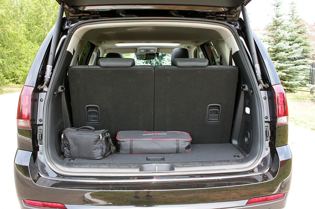 Что же касается второго и третьего рядов сидений, то здесь, как говорится, есть вопросы. Во-первых, из-за наличия рамы пассажирам приходится сидеть со легка задранными коленями, что в дальней дороге немного утомляет. Во-вторых, задняя галерка рассчитана максимум на детей подросткового возраста. Конечно, взрослым можно будет потерпеть 100 километров, сидя на третьем ряду, но «гран мерси» они вам точно не скажут. И при этом от багажника при полностью разложенных сиденьях мало что остается.