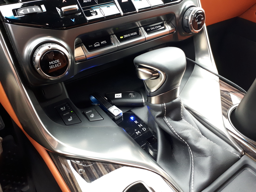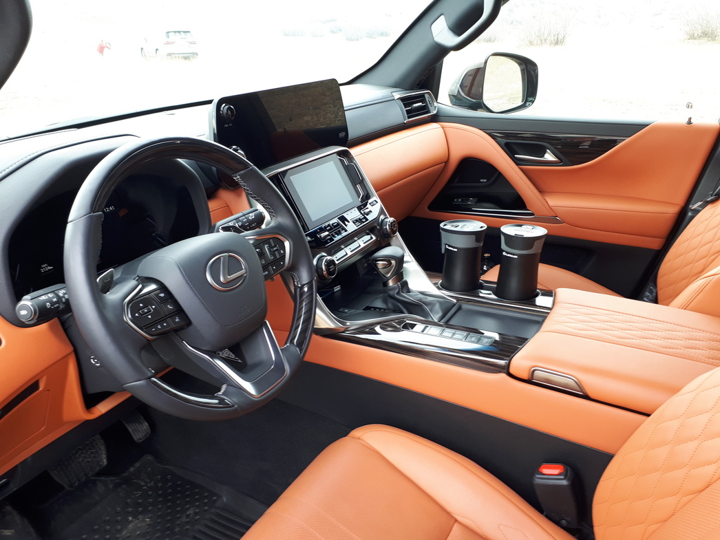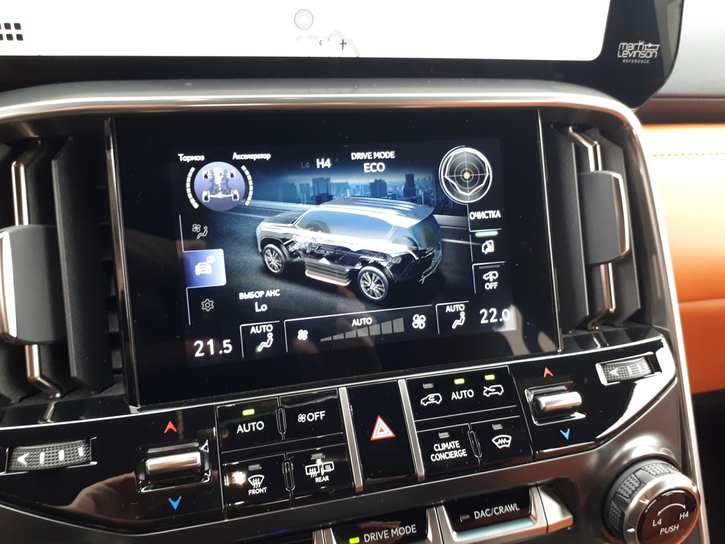 Устраиваясь в кресле, отмечаю, что отделка салона «на стиле и люксе». Если в «Крузаке» мне не хватило дорогих материалов, то у Lexus LX с этим все более, чем в порядке. А вот с инновациями не все так однозначно. Мне нравится, что появилась графическая панель приборов, но вот у селектора «автомата» по-прежнему фиксируемые положения рычага. В такой премиальной машине я бы предпочел увидеть кнопочный пульт управления трансмиссией или джойстик. То есть, какое-то более современное решение.