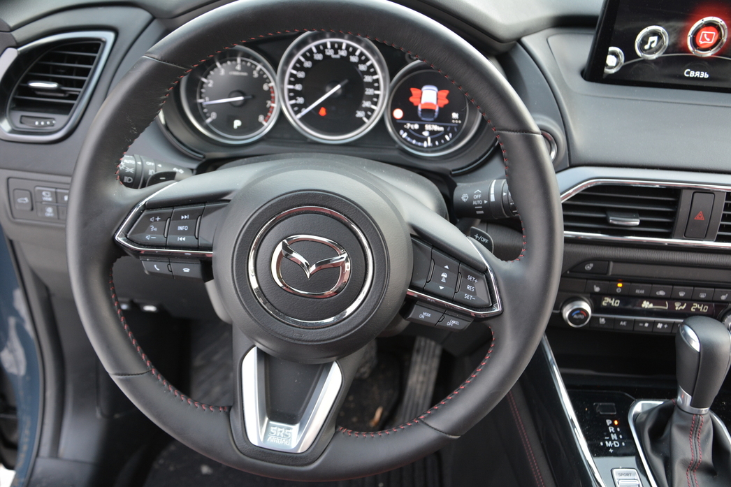 Если говорить об опциях и «фарше», то в CX-9 Noir имеется практически все, что положено современному автомобилю. Речь идет об ассистентах водителя, типа адаптивного «круиза», «подруливалки», следящей за положением автомобиля в полосе, а еще шибко умной электронике, тормозящей «в пол», когда ей чудится, будто драйвер решил устроить аварию на парковке или трассе, и прочих «помощничках». Присутствуют также и проектор текущих циферок скорости на лобовое стекло вместе с подогревами руля и всех сидений.