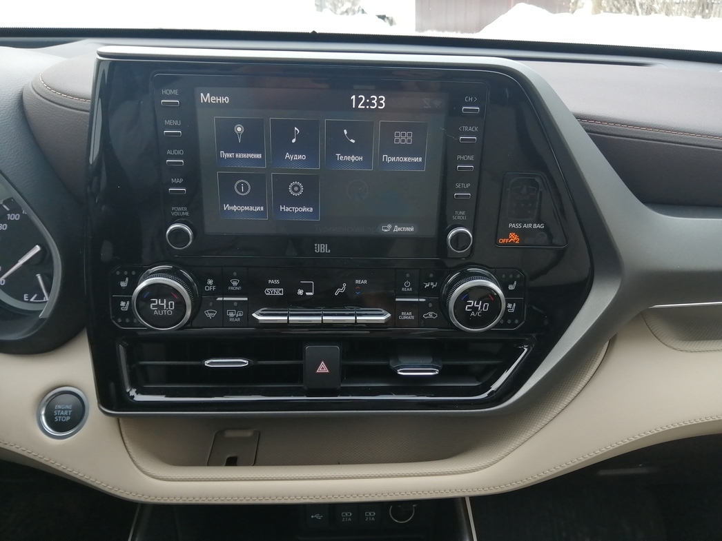 Да, однажды познакомившись с Toyota, ты ни с каким иным автопроизводителем не перепутаешь ее манеру оформлять интерьеры своих авто. У Highlander «тойотовский» стиль бросается в глаза в манере исполнения «приборки», излучением посаженного в асимметиричную «раму» 12-дюймовый экран мультимедиа, пиктограммой и циферок-буковок на кнопочках, разбросанных по рулевому колесу и центральной панели. Ровным счетом отовсюду…