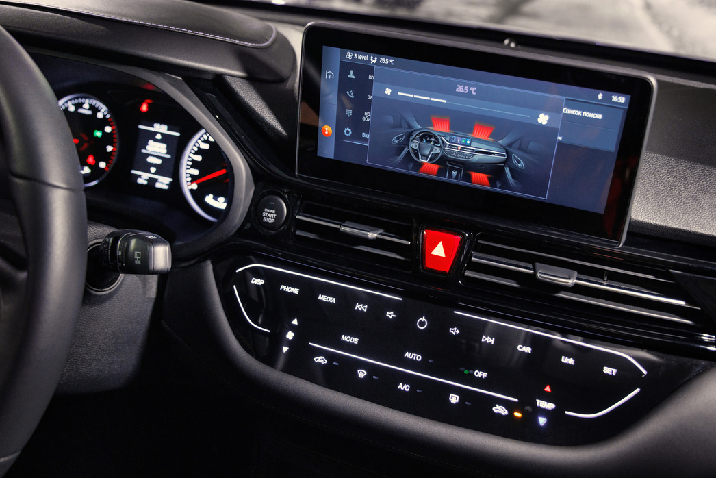 Кресла — плотные, хотя и без ярко выраженной боковой поддержки, а «баранка» лишена регулировки по вылету. Впрочем, устроиться на драйверском месте труда не составит даже баскетболисту — на худой конец, в крыше имеется люк с электроприводом, который, кстати, доступен в «Москвиче» по умолчанию. Из «живых» кнопок на передней панели лишь «аварийка», все остальные — сенсорные. Как, собственно, и парящий штатный монитор.