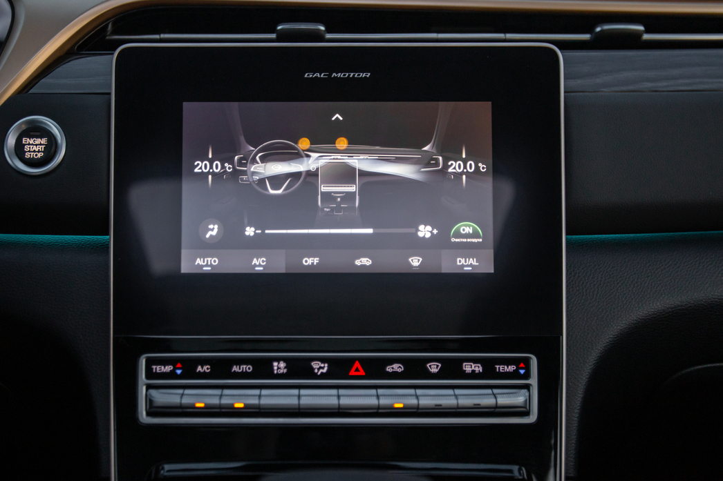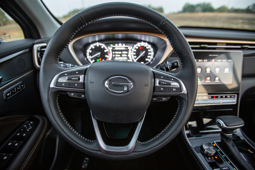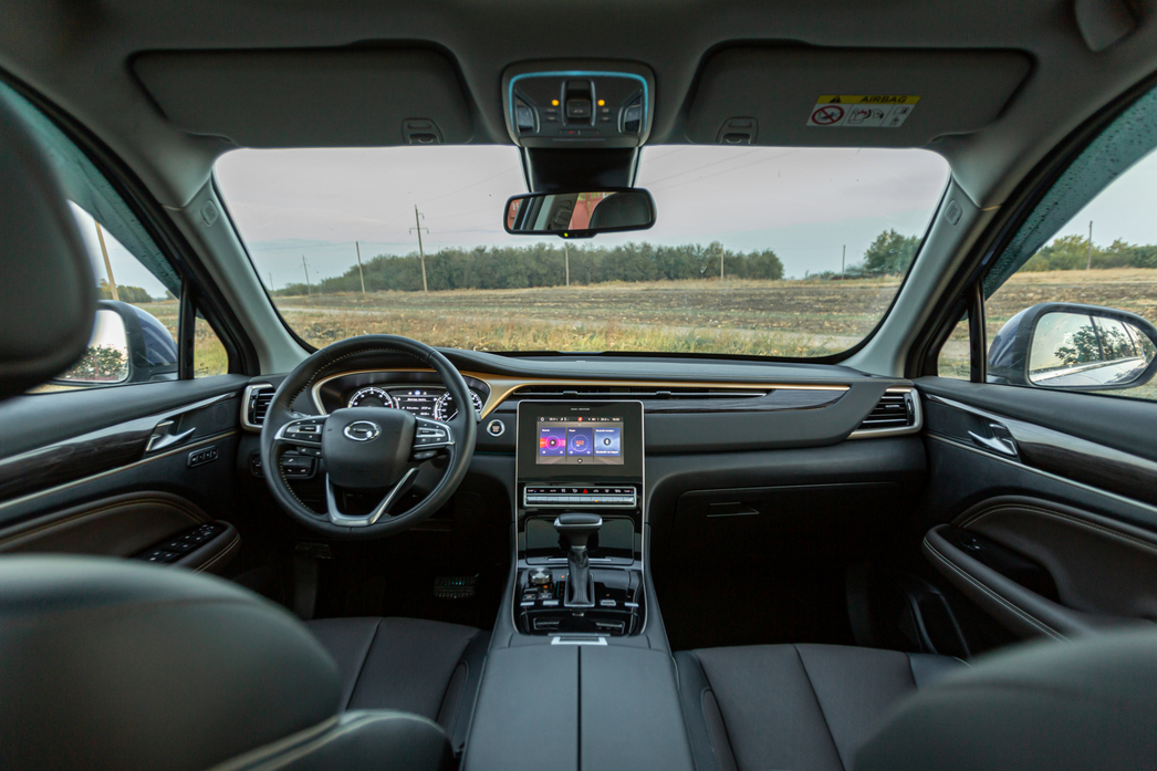 В салоне тоже все ровненько и гладенько, с некоторых ракурсов даже стильно. Обилие различных материалов и цыганская «каретная стяжка», конечно, режет наметанный глаз, но народу нравится. Продукция GAC вообще построена целиком и полностью по канону «Дорого-Богато», и наш кроссовер из общей «линии партии» никак не выбивается. Много экранов и сенсорных кнопок, стильный селектор АКП — именно классического «автомата» Aisin, а не этих ваших «роботов» и вариаторов — здоровенный «телевизор» мультимедийной системы, беспроводная зарядка для мобильного телефона и даже работающий Apple CarPlay. Ну красота же! Жених!