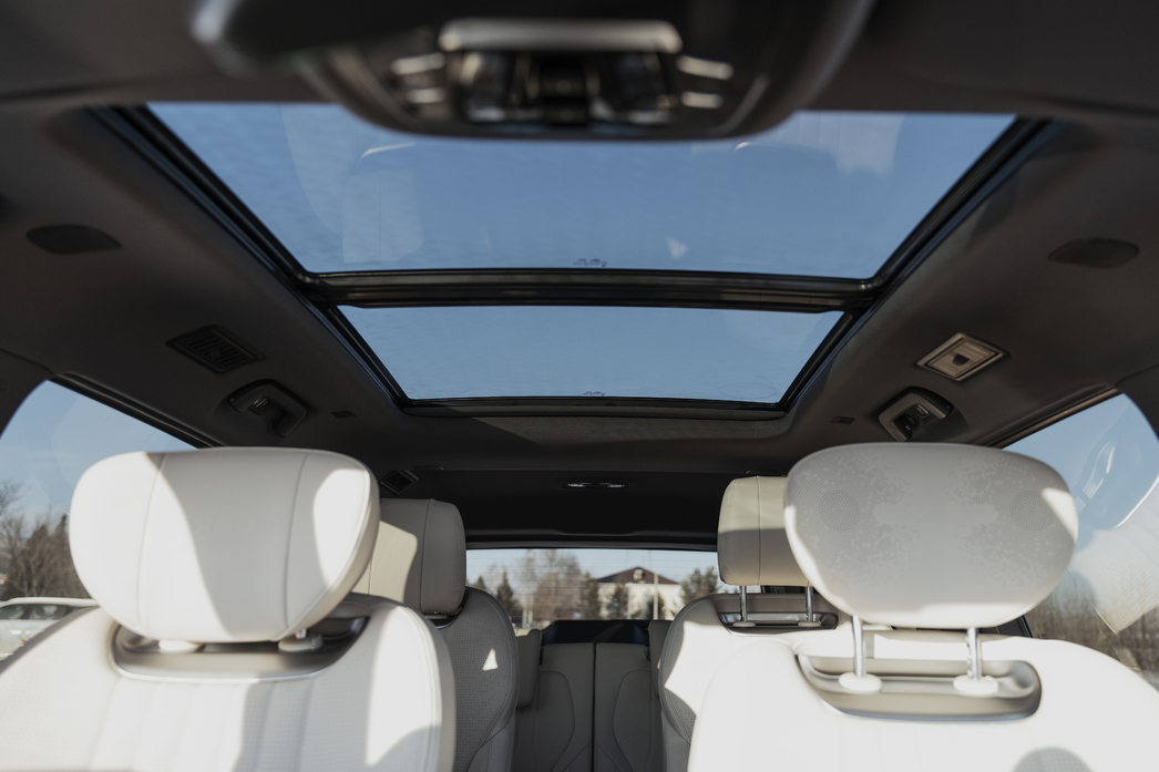 В остальном, на мой взгляд, без откровенных промахов. Приятные ладони материалы отделки, две беспроводные зарядки для смартфонов, трехзонный климат-контроль, проекционный дисплей, ароматизатор с тремя капсулами, королевское сиденье переднего пассажира — с оттоманкой и массажем. Салон просторный, и комфортно в нем везде. На третьем ряду, конечно, с оговорками, но даже рослые седоки макушкой о потолок чечетку на неровной дороге не отбивают.