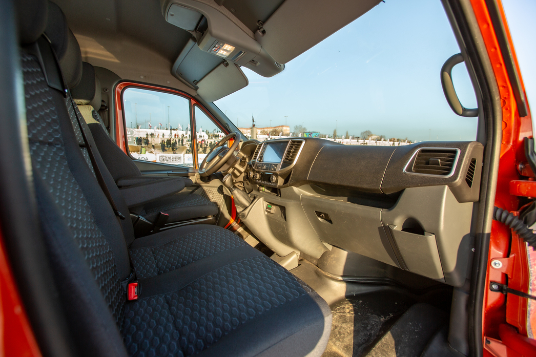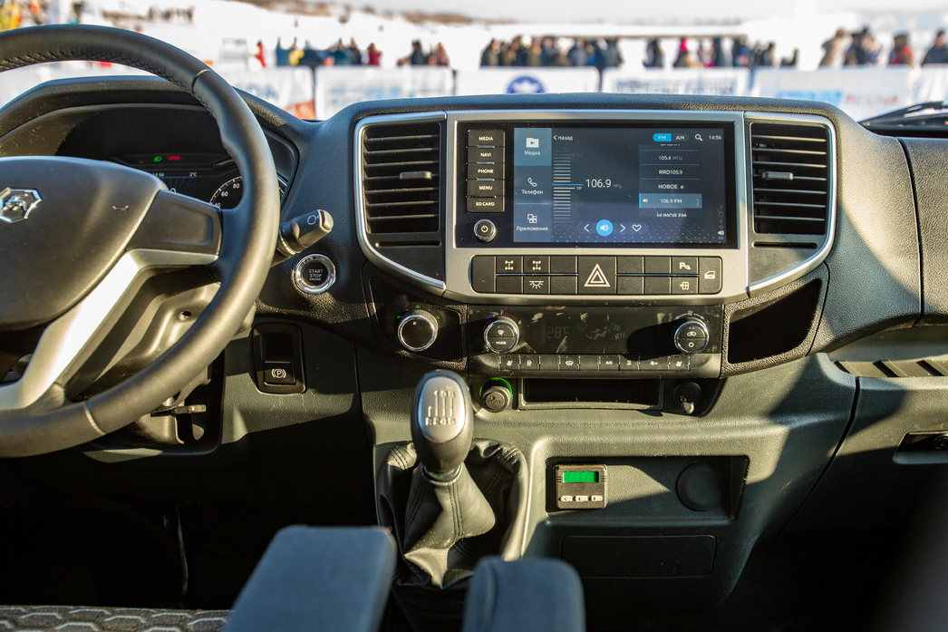 Новый двигатель G-серии все так же тих, вежлив и аккуратен и все так же тяговит, каких-то диссонансов после Cummins водитель не испытывает. Даже высокие обороты не разрывают барабанные перепонки — держись центра и следи за правой ногой. На улице холодно, термометр застыл близ отметки в «-30», но установленный на заводе автоматический догреватель (он же предпусковой подогреватель) не дает замерзнуть — главный зимний недостаток дизельных моторов нивелирован на превентивном уровне. Подумали о людях.