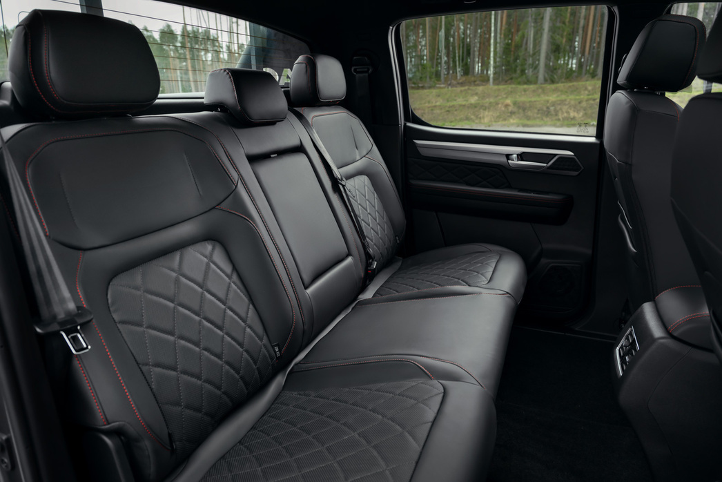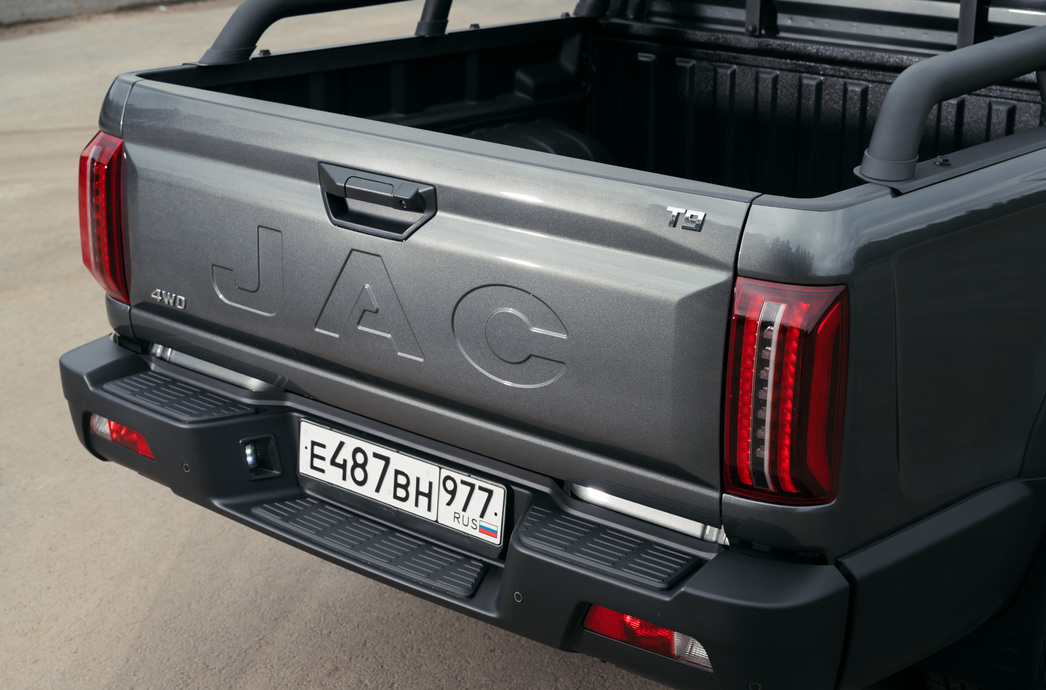 Внутри автомобиль тоже сделан по последнему писку моды. Здесь и отделка из качественного кожзама, и огромный вертикально расположенный мультимедийный дисплей, и здоровый люк, больше напоминающий панорамную крышу, и круиз-контроль (не адаптивный, правда), и беспроводная зарядка для смартфона... Еще из «плюшек» в JAC T9 имеются передние сиденья с электроприводом, 6 подушек безопасности (что, в общем-то, небывалая роскошь для пикапов, хотя на китайском рынке данная модель оснащена аж 7 подушками), климат-контроль, зеркало заднего вида с автозатемнением, камеры кругового обзора. В общем, напичкан пикап таким количеством «ништяков», что иной среднестатистический китайский кроссовер позавидовать может.