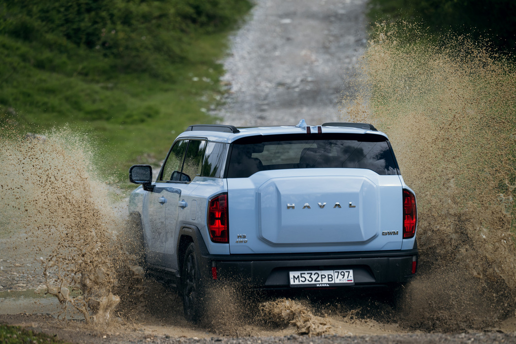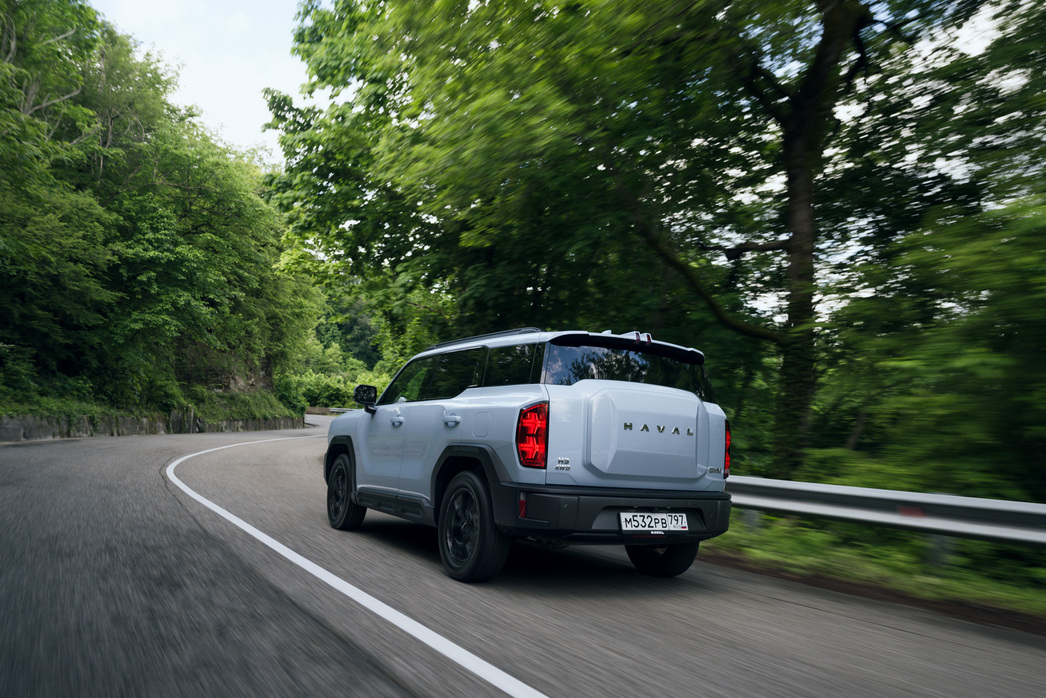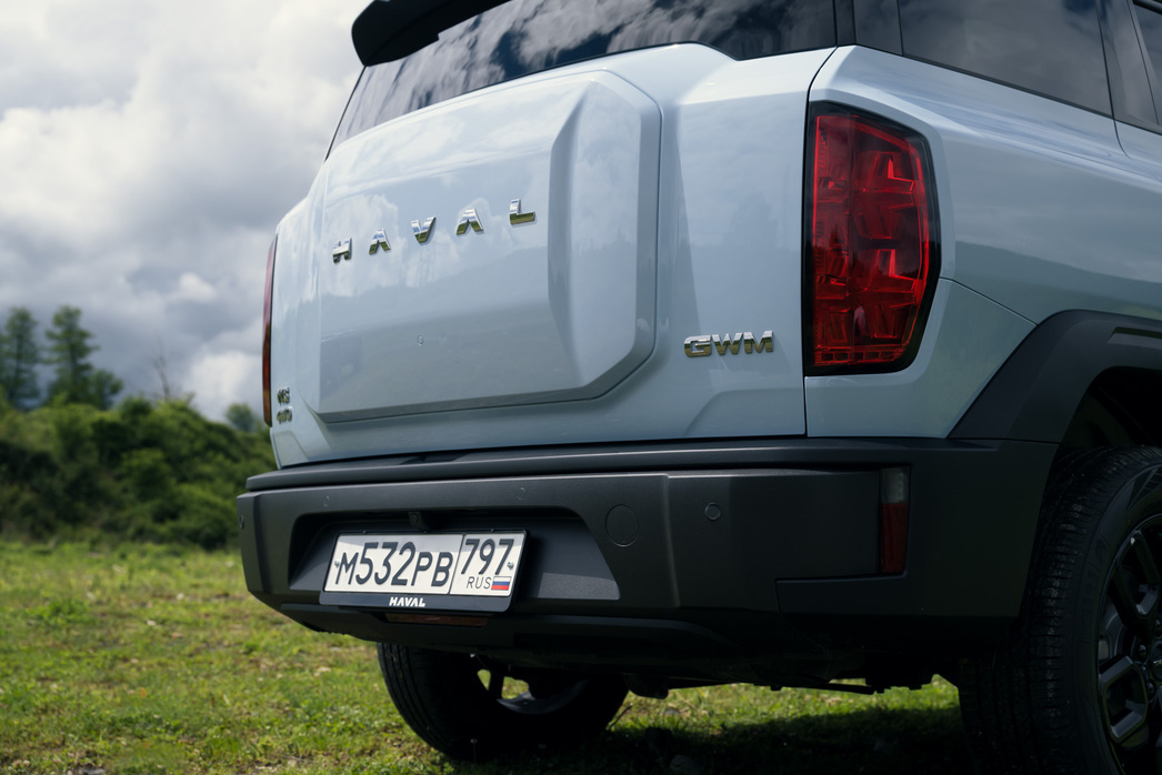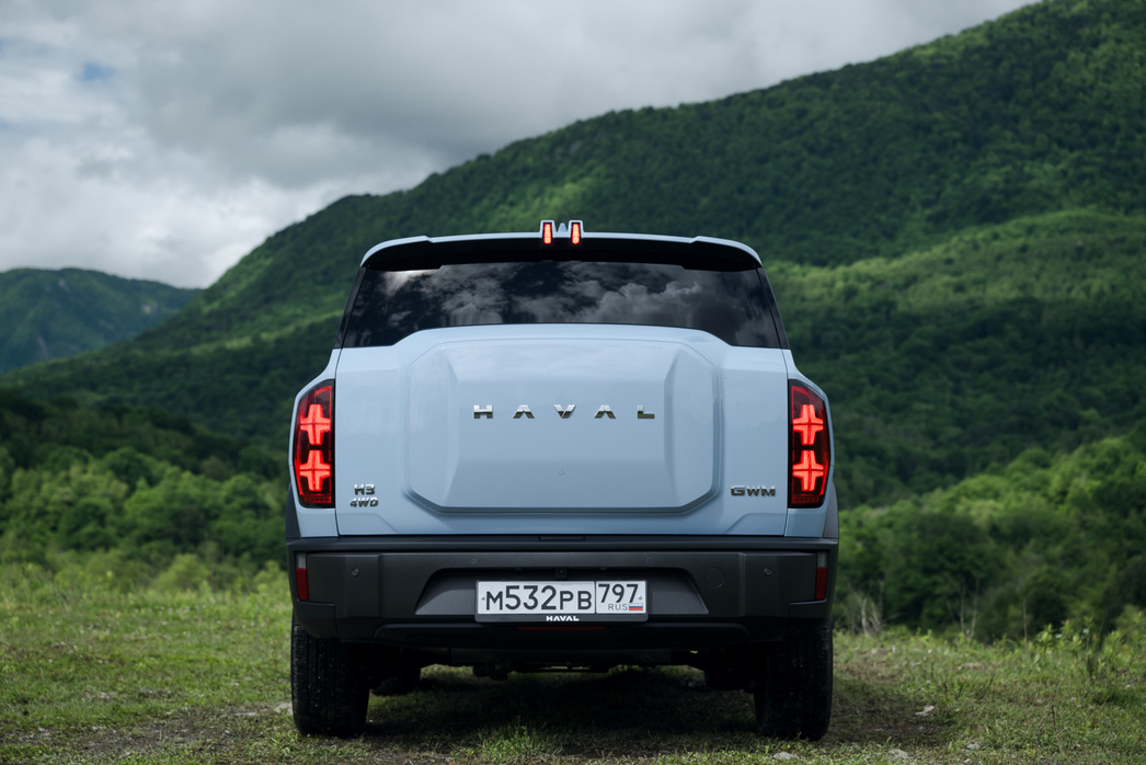 У Mengshi M-Hero 917, который сразу приходит на ум, похожее решение несет функциональный смысл: «запаска» в кофр не влезет, но пара кирпичей — вполне. Здесь же у нас не бокс, а просто элемент дизайна. Впрочем, представители бренда говорят, что и он небесполезен — якобы защищает заднее стекло, обделенное «дворником», от грязи. Ее на сочинских дорогах, где мы знакомились с Haval H3, не нашлось, но из-под колес летело много пыли. И, забегая вперед, скажу, что стекло в самом деле оставалось чистым.