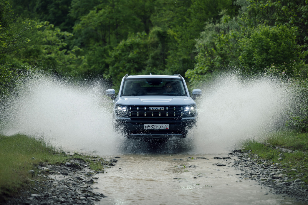 Вспоминаем про «внедорожный потенциал» кроссовера и съезжаем на каменистый берег реки Шахе. Клиренс 196 мм и углы въезда/съезда 21 и 25 градусов внушают некоторую уверенность, однако все равно волнительно. Раскачиваясь на валунах, Haval H3 пробуксовывает, но белый флаг не выбрасывает. Нежная коробка перегреть себя не дает: до характерного запаха дело дошло, до предупреждения на приборке — нет. Выкарабкался. Похвально.