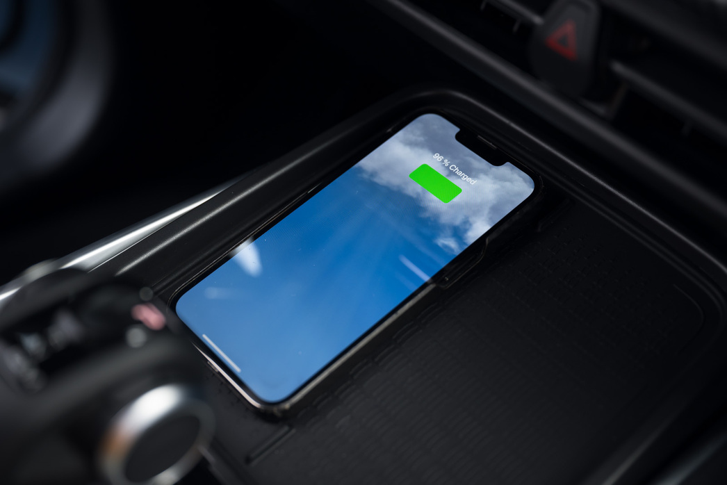 Сам информационно-развлекательный комплекс интуитивно понятен и удобен. К качеству изображения и скорости реакции на касания вопросов нет. Под тачскрином мультимейдики и парой дефлекторов — большая площадка для двух смартфонов. Причем «водительская» половина — с беспроводной зарядкой мощностью аж 50 Вт. И как по мне, так место для гаджетов выбрано удачное: экран мобильника с навигацией всегда находится в поле зрения.