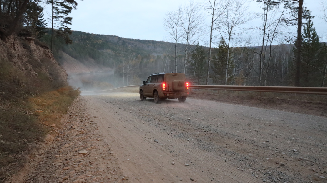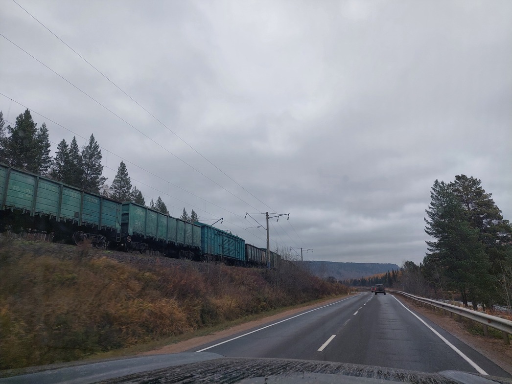 Столбы попрятались в сырых облаках, поэтому пришлось идти далее по маршруту. Красноярск покидали в пробках. В сторону Иркутска — сплошной ремонт при том, что попутных машин — в избытке. Тут пригодился активный «круиз».