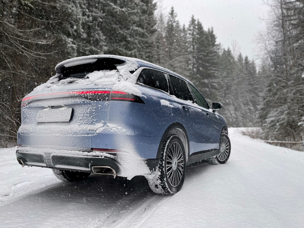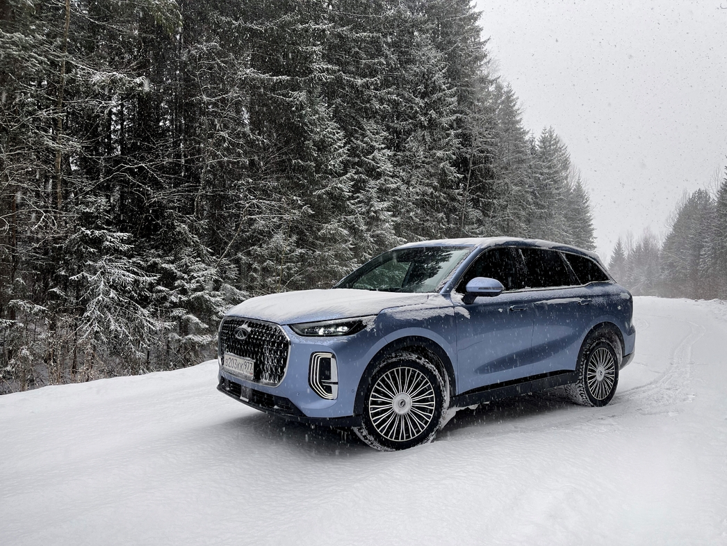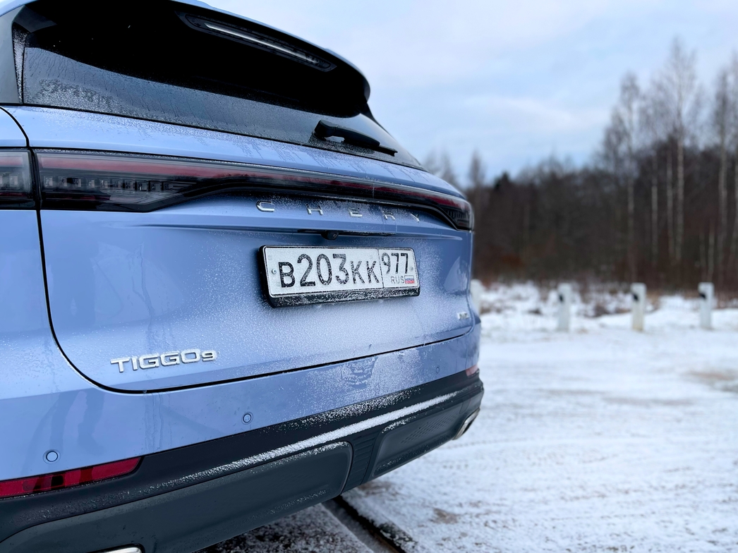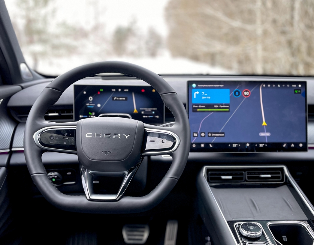 Также стоит отметить выдвижные ручки дверей — их электропривод был усилен специально для России, чтобы они лучше сопротивлялись обледенению. Колёсные диски диаметром 20 дюймов с необычным рисунком — это, пожалуй, самый яркий элемент дизайна. Tiggo 9 выглядит так, что, если и привлекает внимание, то не потому, что пытается, а потому что он просто хорошо сбалансирован.