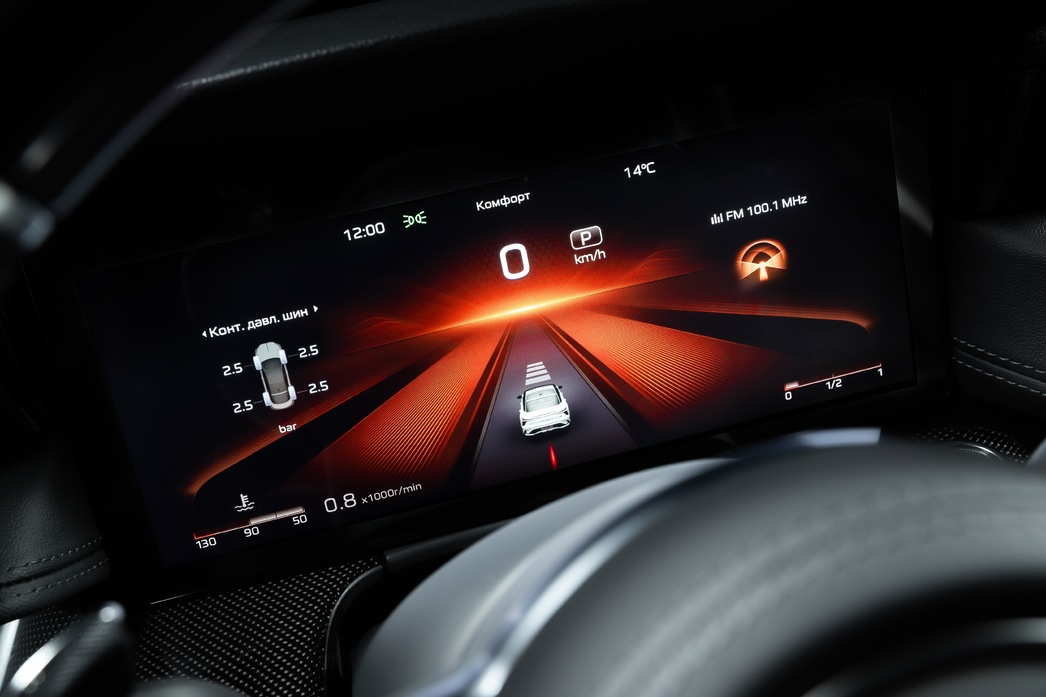 Руль — отдельная песня. Толстый, с карбоновой вставкой (настоящей или «под настроение» — не суть), с алькантарой понизу в топовом исполнении: типа как у Porsche, только дешевле. И если вам этого недостаточно, то к вашим услугам 12,3-дюймовая приборная панель и вертикальный, элегантно утопленный в переднюю консоль 12,6-дюймовый экран мультимедийки.