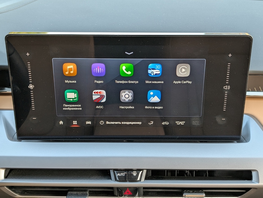 Центральный 10,1-дюймовый дисплей встречает чистотой графики и логичным меню. Правда, его реальная рабочая площадь кажется скромнее из-за сенсорных ползунков громкости и обдува, встроенных в толстые боковые рамки. Зато удобно: палец сам находит их без лишних движений.