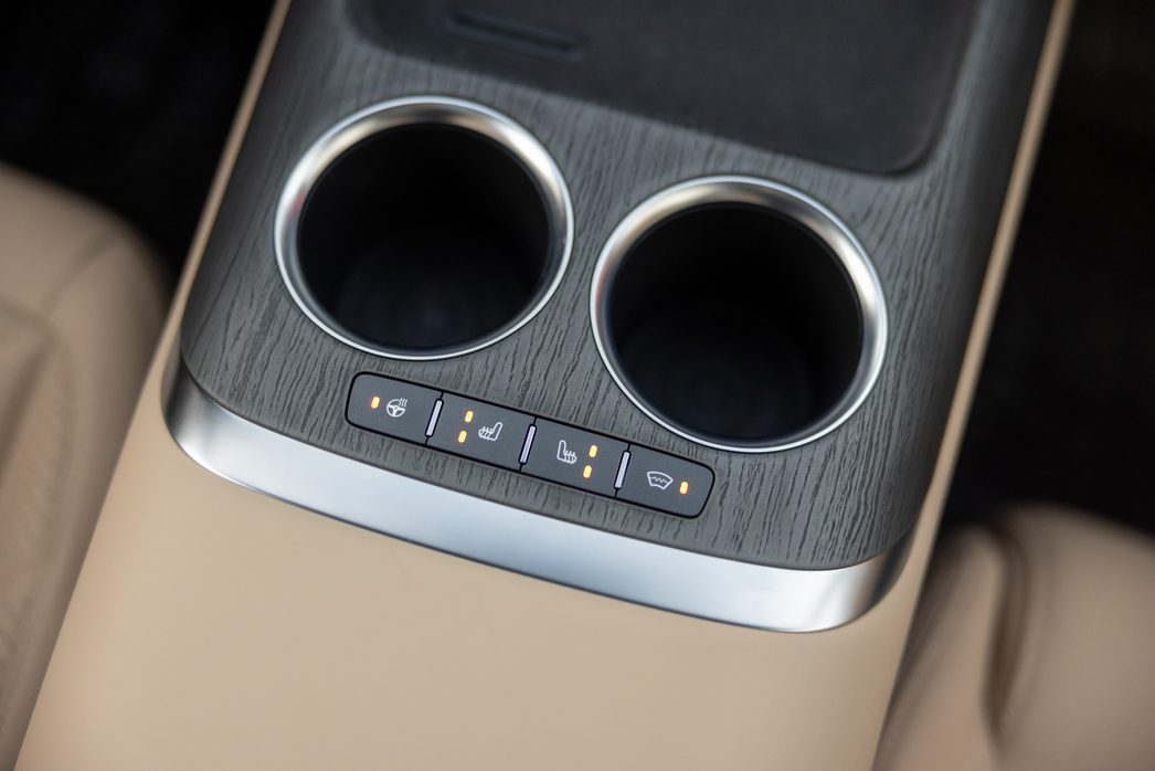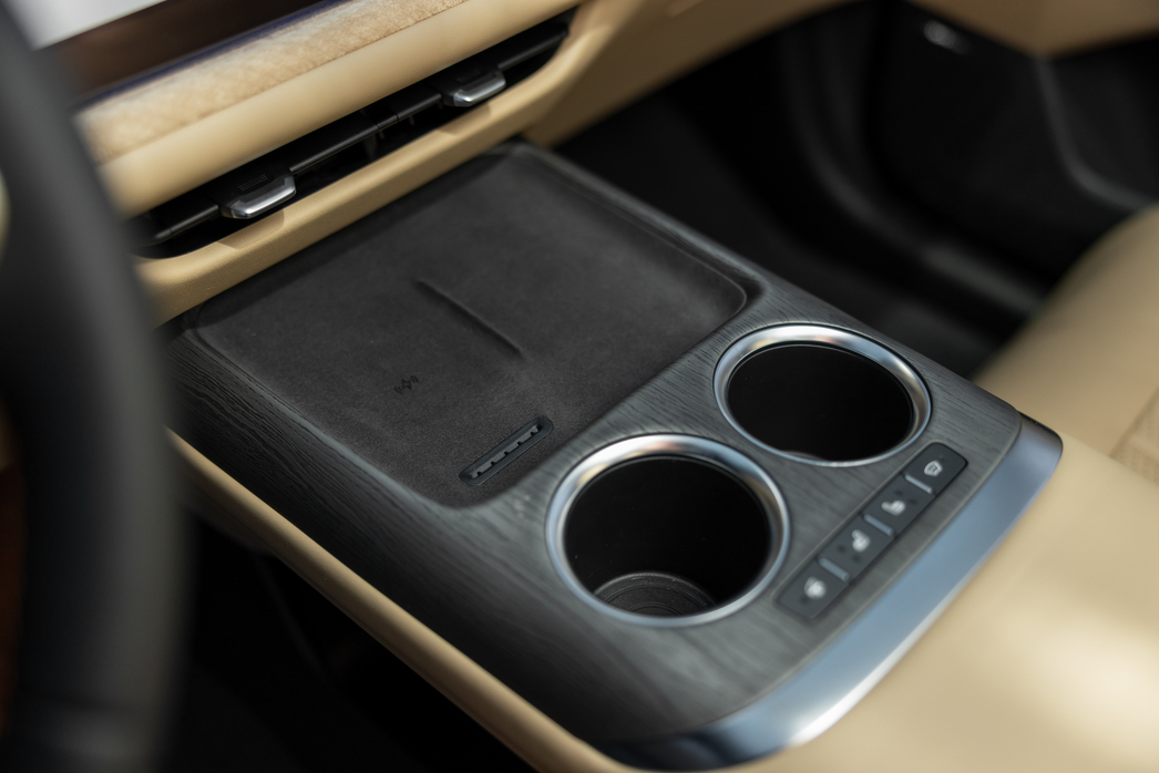 Порой забываешь и том, что селектор коробки передач тут не в традиционном месте, а под рулевой колонкой. Поначалу это даже вызывает лёгкий ступор: рука тянется к центральному тоннелю и находит там пустоту. Но довольно быстро осваиваешься, одобряя такое решение. Освободившееся пространство заняли подстаканники и площадка для пары смартфонов — левая половина с беспроводной зарядкой мощностью 50 Вт с охлаждением. Она, кстати, реально «напитывает» мобильник быстро, и телефон при этом не превращается в раскалённую сковородку — проверяли специально.