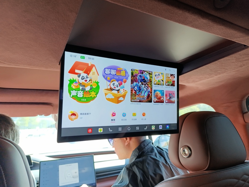 Перед тем как тронуться, оцениваю задний ряд. Тут он главный. Есть два раздельных кресла с электрорегулировками, вентиляцией, массажем и оттоманками. Однако пространства для ног хотелось бы иметь чуть больше. Под потолком — большой монитор. В общем, не хуже, чем у конкурентов. Про третий ряд особо сказать нечего. Он есть — и на том спасибо. Места не слишком много, хватит разве что для детей.