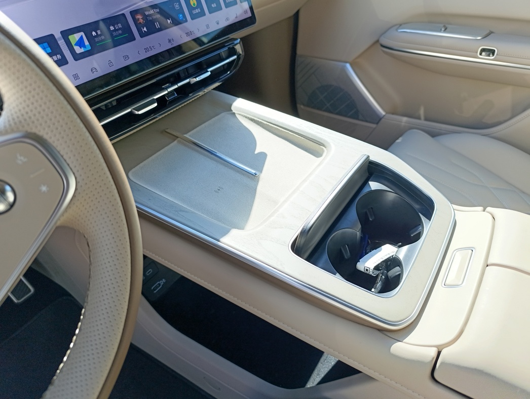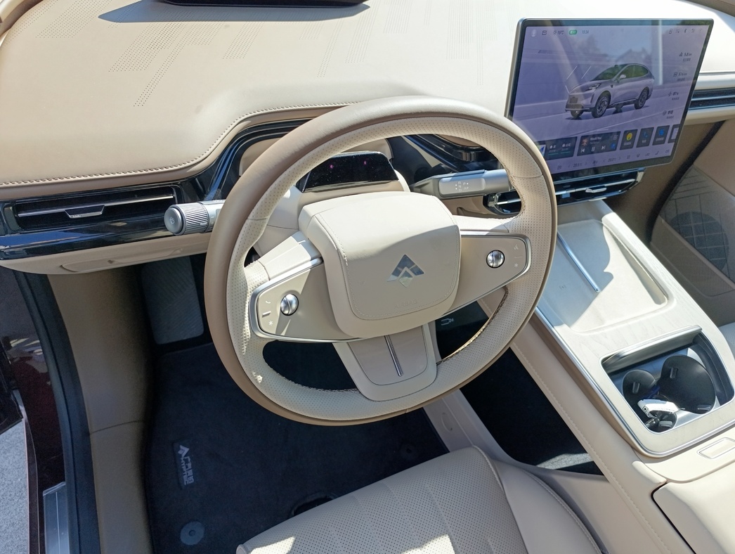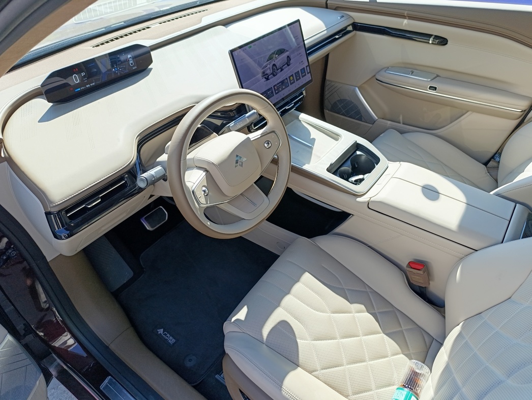 Салон исполнен с явным расчетом на публику, уставшую от спартанского минимализма Tesla. Отличная отделка кожей, мягкий пластик, аккуратная подсветка. По центру — большой сенсорный дисплей. А вот цифровая приборка — крошечная. Ее разместили почти у основания лобового стекла. В общем, типичный китайский подход.