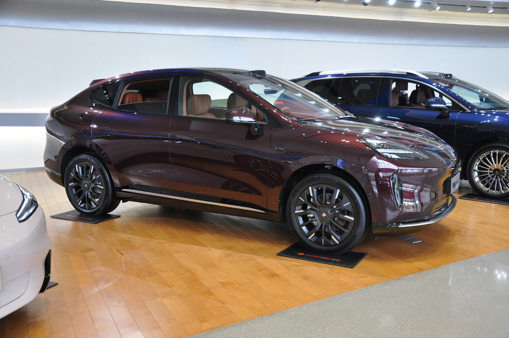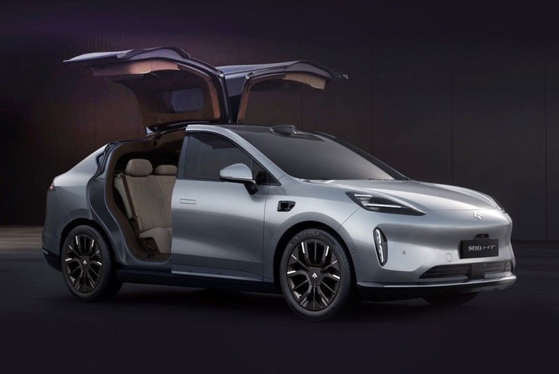 Главной «фишкой» нашего героя стали распашные двери с подъемным механизмом, которые в концепте открывались почти как шлюз космического корабля. Именно здесь впервые появились те самые «крылья чайки», что перекочевали на Hyptec HT. В серийном варианте, показанном в 2024-м, двери, конечно же, проще. Тут китайцы явно подсмотрели идею у Tesla Model X. Также как и у электрокара Илона Маска «крылья» оснастили дополнительными шарнирами. Они могут «складываться» в условиях тесной парковки.