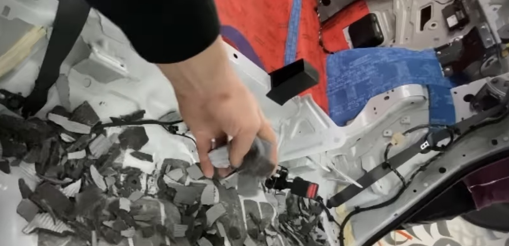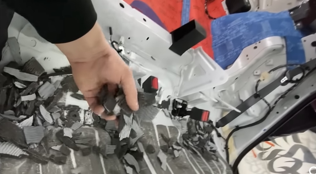 Воистину, зрелище не для слабонервных: китайская «шумка» просто раскрошилась, превратившись в россыпь мелких и твердых элементов, которые и бренчали. Не просто отклеилась или потрескалась, а именно отвалилась и раскрошилась, что говорит о неподходящем качестве самого материала для российских погодных условий.