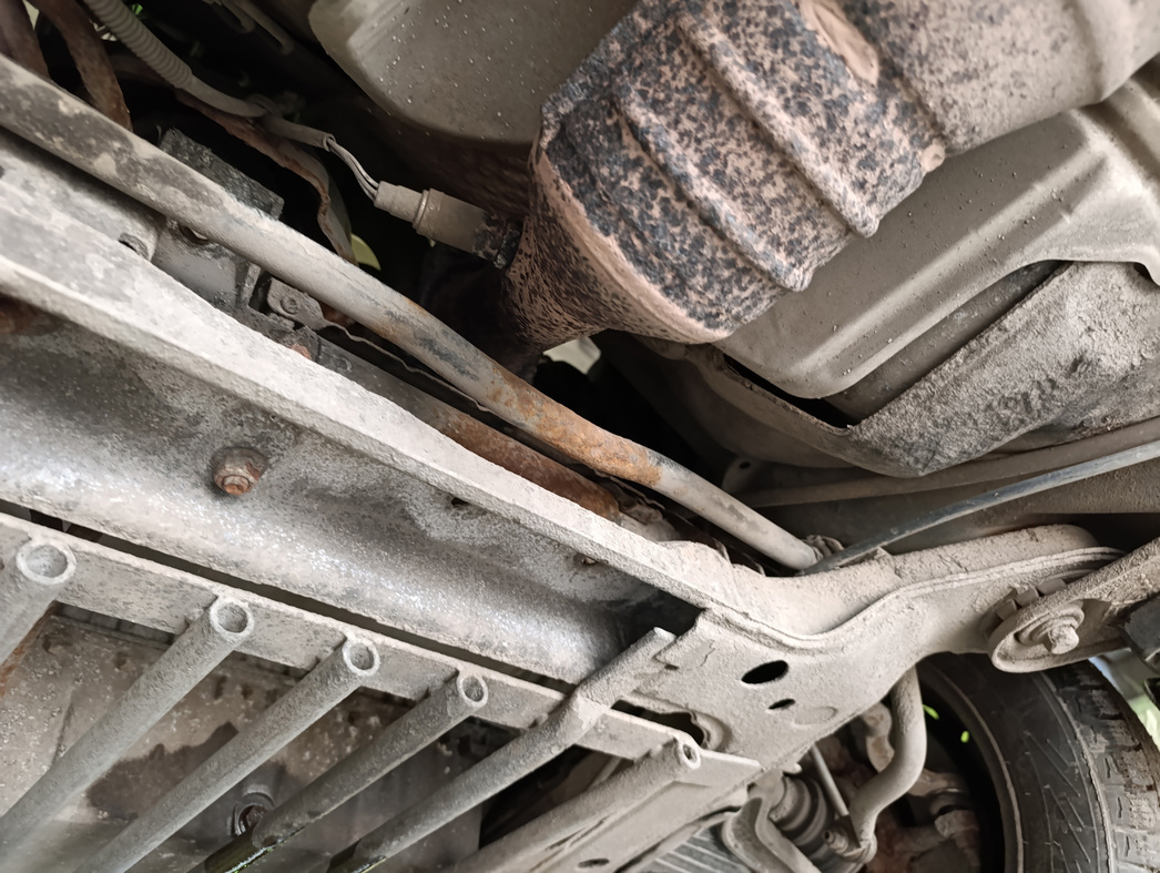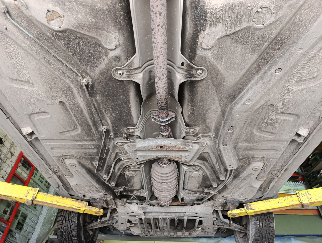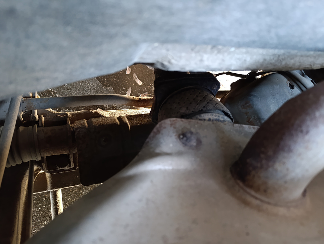 Первый нюанс: открыв капот, осмотрите гофру глушителя, ее хорошо видно. Если она такая, как на фото — деталь надо менять. И вот тут ждут сложности: сверху к ней хороший доступ, а вот снизу плохой. Мешают подрамник, стабилизатор, да и нейтрализатор расположен близко — подлезть удается не любым сварочным аппаратом. Поэтому некоторые мастера сразу советуют снимать выпускной коллектор.
