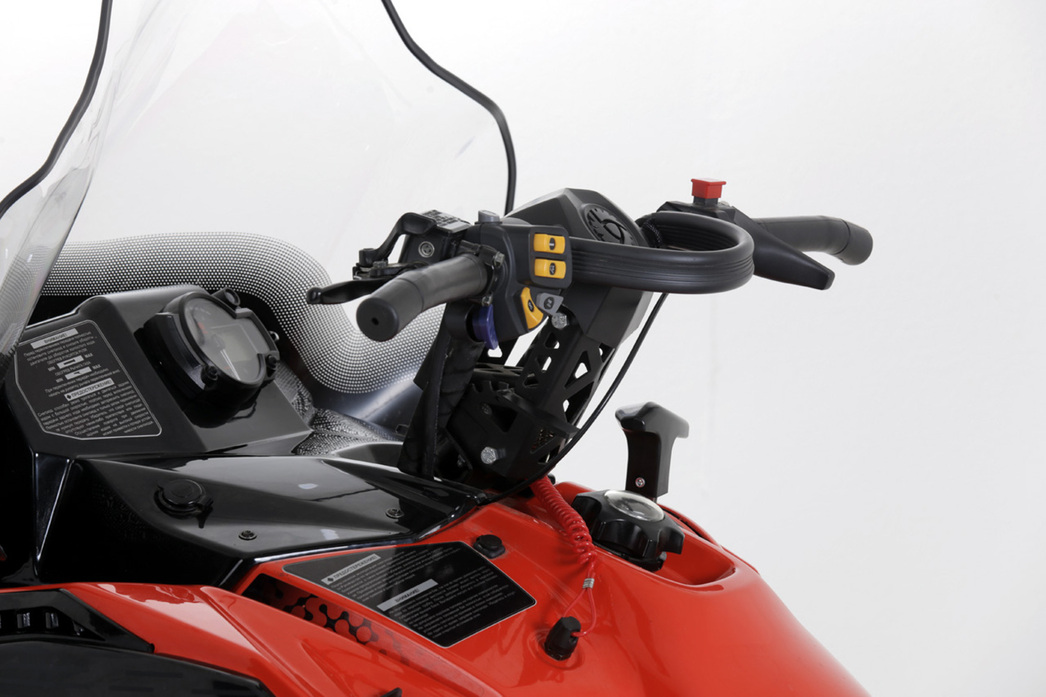 Несомненной изюминкой новинки можно назвать рулевую колонку, регулирующуюся по высоте и углу наклона. На снегоходах такое редко встретишь, а между тем подобная конструкция гарантирует удобную эксплуатацию при любой манере езды. Если предстоит длинный многочасовой переход в сидячем положении, то руль можно опустить пониже. Ежели появилось желание прохватить по целине, то под спортивную манеру езды в положении стоя рулевую колонку можно настроить буквально за одну секунду без использования отверток и гаечных ключей.