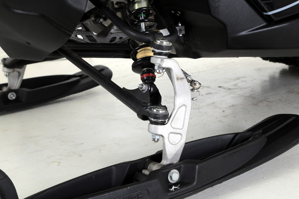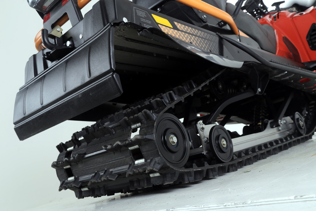 Пару слов о подвеске. Кого-то эксклюзива или авторских технологий мы здесь не увидим. Спереди стоит традиционная для туристических снегоходов многорычажка с пружинно-гидравлическими амортизаторами, регулируемыми по жесткости. Сзади — тележка на склизах, которую также «подпирает» пружнинно-гидравлический амортер с возможностью настройки.
