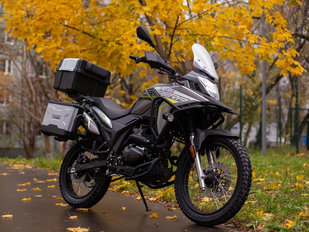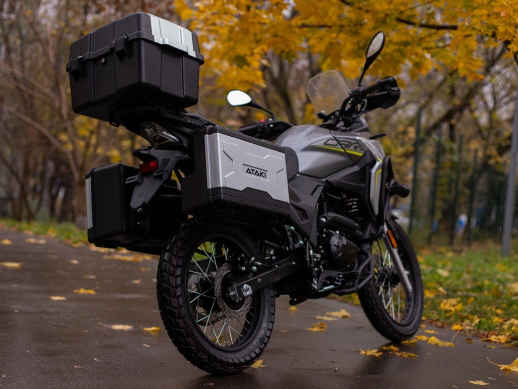 Самый бюджетный «эндурик» в обзоре — Ataki Carrera 300. Этот вседорожник с одноцилиндровым 4-тактным двигателем ZONGSHEN PR300 объемом 271 см3 выдает 24 «лошадки» мощности. Движок с карбюратором и 6-ступенчатой коробкой надежен и прост в эксплуатации, к тому же, переваривает практически любое топливо. Бака на 16 литров хватает на длительные покатушки, поскольку Ataki весьма экономичен. Передняя подвеска — телескопическая вилка с ходом 131 мм, сзади же используется моноамортизатор с ходом 39 мм. Уже в базовой комплектации имеются багажные кофры, защитные дуги, дополнительный свет и USB-разъем. Простота и надежность конструкции подкрепляется весьма демократичной ценой — за Ataki Carrera 300 дилер попросит всего 259 990 руб.