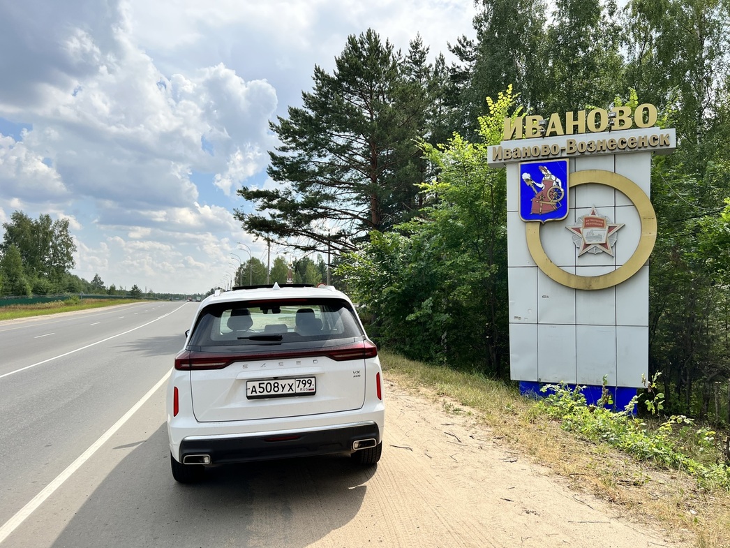 Чуть больше ста километров от Костромы все по той же трассе Р132 пролетают незаметно. Топливом, напомню, я в этом волжском городе не запасся, понадеявшись на довольно скромные аппетиты моего «коня». И китайский полноразмерный полноприводный кроссовер Exeed VX действительно не подвел — только на самом подъезде к «ситцевой столице» России машина напомнила, что пора бы и «закусить».