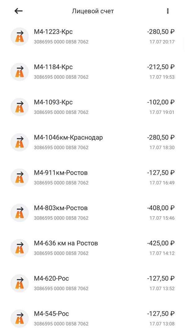 Теперь о тратах на платные участки. На первый мы заехали в 7-59 утра, последний проехали в 2-17. Всего их, согласно приложению, восемнадцать штук. Напомним, что оплачивали их с помощью транспондера, а скидку приобрели заранее. Итого имеем 3612,5 рублей.