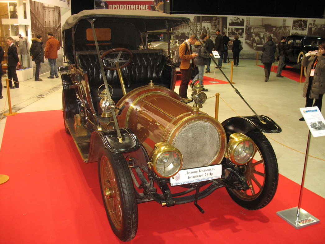 Сразу на входе в «ГОНовский» зал привлекает внимание 100-летний чудо-бензиномотор. Фаэтон Delaunnay-Belleville модели Belvalette 24 Hp. Известно, что именно «моторы» французской фирмы «Делано-Белльвиль» предпочитал использовать для езды последний русский император (и «по совместительству» – фактический основатель Гаража особого назначения) Николай II. Таких Delaunnay разных моделей и лет выпуска для Собственного Его Императорского Величества гаража было закуплено несколько (в том числе и самый первый царский автомобиль был именно этой марки).