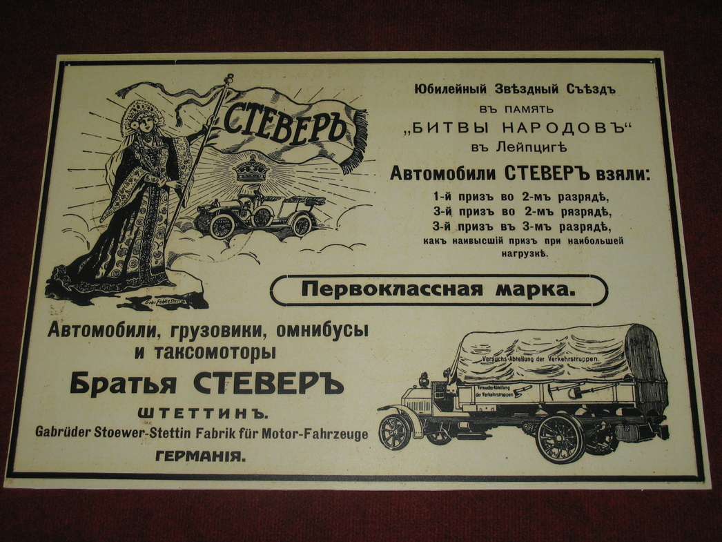 Этот «Штевер» был выпущен в 1899 году и продан в России. Между прочим, автомобили данной фирмы пользовались тогда в нашей стране изрядной популярностью. Представительства имелись во многих городах — в том числе не только в обеих столицах, но и в Воронеже, Ярославле, Самаре, Симферополе, Сочи. Покупателей заманивали рекламой, в которой утверждалось, что Stoewer отличается «наивысшей простотой конструкции, внутренней точностью, долговечностью, высоким достоинством, изящным стилем выполнения, экономичностью в употреблении». Однако на названии своего детища создатели его явно не стали экономить. Длиннющее обозначение модели в переводе с немецкого означает «большой моторный экипаж».