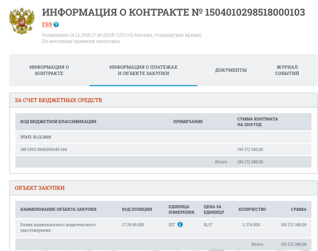 А если точнее, то за печать этого «документа» тиражом 2 374 000 экземпляров из госбюджета было заплачен 193 172 380 рублей, что следует из контракта № 21.1−19/ЦСН-001 от 10.12.18, вывешенного на сайте госзакупок. Контракт этот со стороны Госавтоинспекции подписал замначальника Центра специального назначения в области обеспечения безопасности дорожного движения МВД РФ г-н Арнаутов.