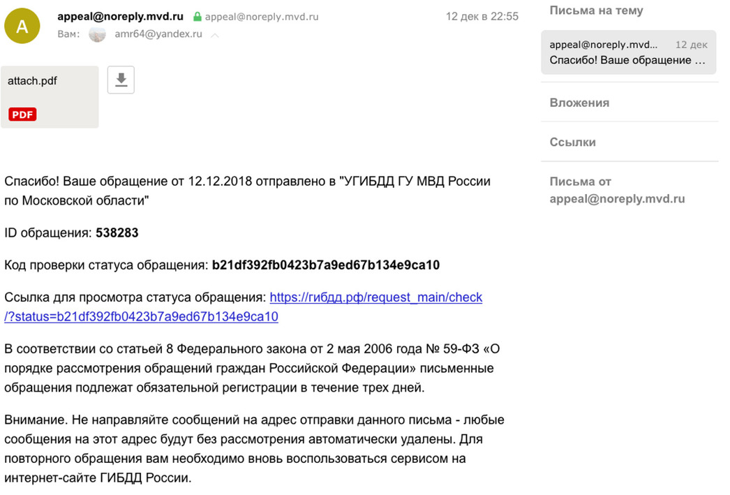 Любопытно, что и банковская, и госуслуговская инструкции совпали один в один: зайдите на сайт https://гибдд.рф/, в разделе «Сервисы» выбирете подраздел «Прием обращений», опишите проблему и прикрепите необходимые документы. В принципе, я и сам все это знал, но уж очень не люблю общаться с гаишниками ни по какому поводу, не рассчитывая на их профессионализм. А тут, к моему несказанному удивлению, сработало!