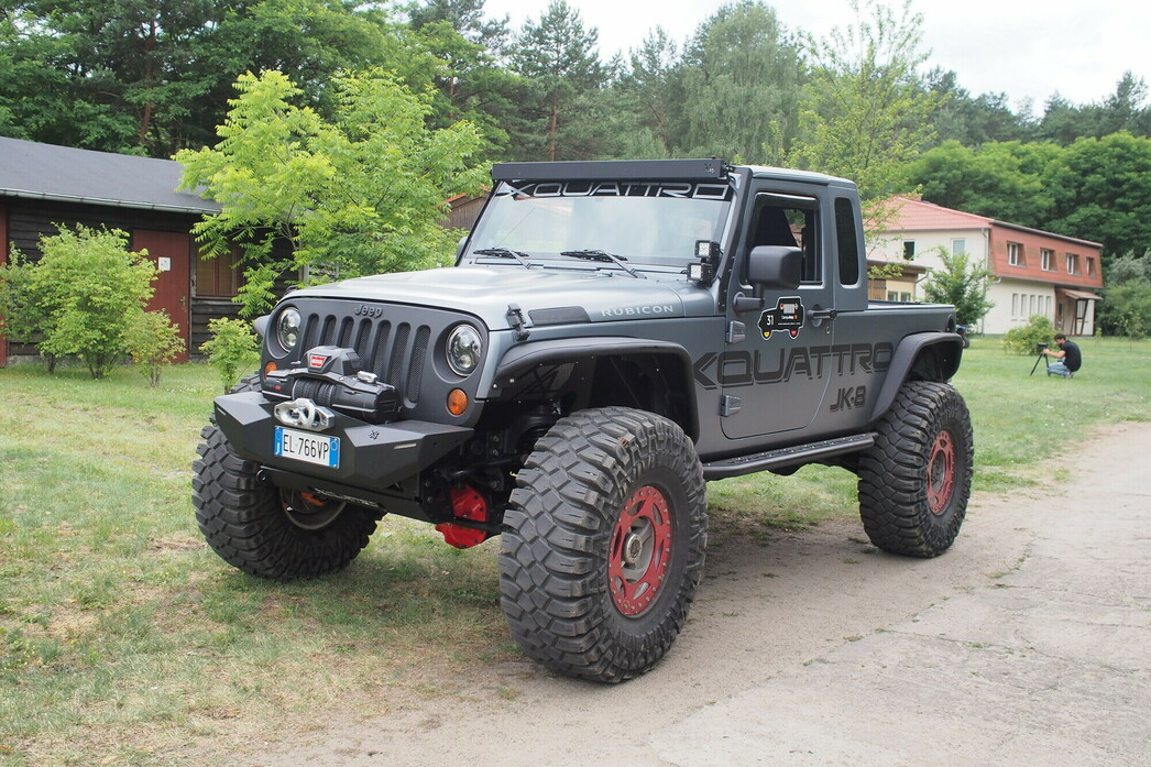 На самом виду, конечно же оказались обширные парковочные площадки, на которых гости оставляли свои машины. И, надо заметить, что помимо вполне серийных «Джипов» там можно было наткнуться на весьма интересные экземпляры. Например, Renegade Rat Rod привлекал внимание зевак своей потрясающей матовой окраской кузова. Неподалеку от него спрятался в кустах пикап Wrangler проекта JK8 — автомобиль не новый, но в России весьма редкий. Мне лично его встречать не доводилось ни разу. Помимо прочего, он был серьезно подготовлен для внедорожных подвигов — в чем нетрудно убедиться, взглянув на его колеса и подвеску.