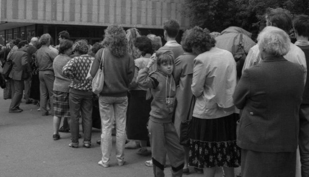 А ведь очередь, если кто забыл, а то и не знал — была символом и главным организационным моментом предыдущей эпохи, когда потребление осложнялось отсутствием реализации. Хотелось всегда одного и того же, но в прежней жизни вместо удовлетворения была очередь. И ожидание. Иногда в несколько часов. Иногда в несколько лет. Иногда — десятилетий. С поправкой на отсутствие товаров.